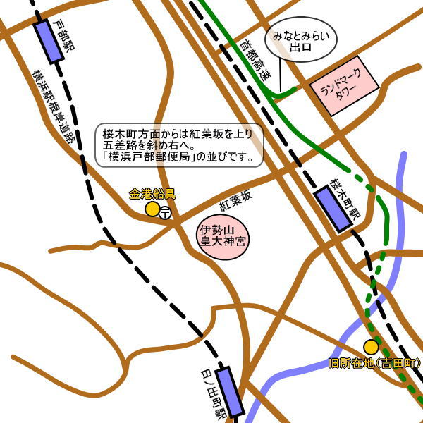 2006年5月に移転しました。以前の所在地からは徒歩15分程度の場所です。 JR根岸線で横浜駅-桜木町駅間を通過するとき、海(みなとみらい地区)とは反対側を眺めていると、とても急な坂を見ることができると思います>。それが「紅葉坂(もみじざか)」です。この坂の上の見晴らしのいいビルへ引越ししました。 JR桜木町駅・市営地下鉄桜木町駅から徒歩12分です。 駅からは線路沿いに横浜駅方面へ。5分程度歩くと紅葉坂に着きます。とても急な坂道なので迷うことはないと思います。この紅葉坂を上りきると>五差路があります。片側2車線の「横浜根岸道路」を右方向へ。「横浜戸部郵便局」の並びの黄色い外壁が印象的なビルです。 京浜急行線 日ノ出町駅からは徒歩14分ほどかかります。 駅からは左手に伸びる坂道をそのまま上っていくと五差路へたどり着きます。交差点付近では左手前方に当社ビルを確認することができます。 受付は2階になっておりますので、エレベーターをご利用ください。 |